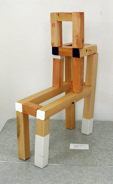 The idea was to place the chair at the end of the top of the table, as though it were thinking about jumping off. But in the construction of it, it somehow morphed into a minotaur-looking form. As I put it together I decided not to remove the printed numbers on the stock. Feeling as though I should acknowledge the numbers, I added them up in order and the total was seventeen. Then I wondered how many pieces were in the construction. Turns out there are seventeen. So, I stamped 17 on the back side of one of the posts. Then I thought I should write a haiku (seventeen syllables). It's a unique and satisfying experience to discover a work of art, while making it. The fly was added for grins.