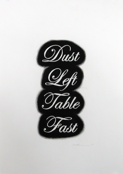 This drawing consists of words that are all contronyms. They have two meanings, one of which contradicts or is opposite to the other. As in dust something off or dust it on. Fast can mean moving quickly or holding in a fixed place. Left can mean leaving something behind, or like table, left for later. Table can either mean "on the table" for discussion or table for later. As I was making the drawing it occurred to me that it was a drawing about its own creation. When I shaded with the charcoal it created dust that was then blown off the table fast and what was left was the drawing. Yet another work that revealed itself in it's making.